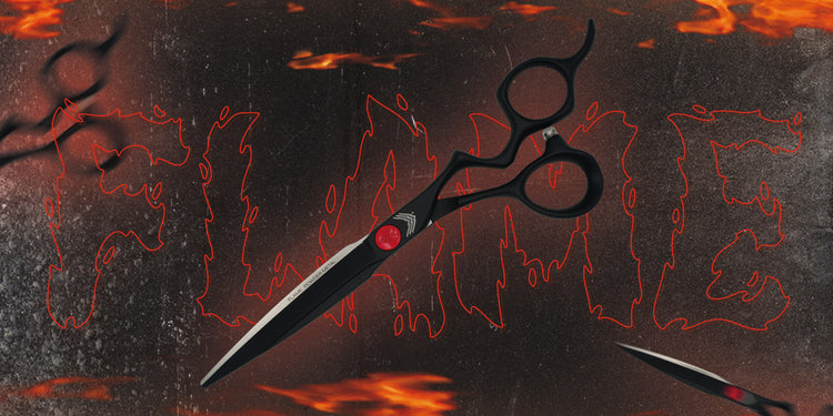FLAME.Forbici da taglio in acciaio POWDER METAL, con lama convessa piramidale in colorazione TITANIUM MATTE BLACK.La vite centrale adotta lo SCREW FIRE SYSTEM di colore ROSSO, che raffigura una fia...